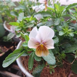 こんにちは😊☀️ お迎えビオラ その1。フロステッドチョコレート。3.5寸苗。直ぐに売り切れて人気が凄いです🙄 [植え付け記録] 鉢 :6号プラ(ビオラ用)〜セリア〜 土 :培養土(6割)、鹿沼土(4割) 底石:薄め(ネットに入れて) 他 :マガンプk、オルトランDX …浅かったので、鉢底石要らなかったかも?根っこが下には伸びにくくなっちゃうかも?←次回に活かそぅ✍️ 横には伸びる事は出来そうなので、それを期待。(水をやり過ぎる癖があるので鉢は小さめで) 根はりはとても良かったです。…ほぐして植えたので養生します 買ったネットサイトによると、水をあげてから植え付けすべきだったようで💦後からみました😅植えてからたっぷり水やりました。(この後の水は控えょ。)