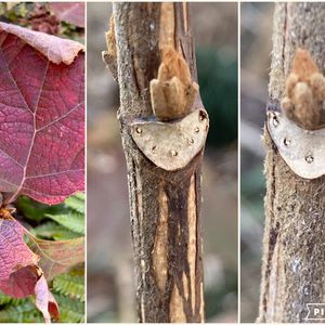 ❄️クイズ冬芽葉痕❄️ 紅葉した葉の下に 色の白いお顔の、可愛い子がいますよ 枝の上の方の子は、おしゃれな焦げ茶のコート 根本の方の子は、焦げ茶を脱いで ベージュのもふもふのコートを着ています あれっ 帽子は何処でしょうか? まだ葉が落ちてないから 頂芽が、見えなかったんですね 頂芽を王冠のように被る 準備中の王子の名前はだれでしょう? 答えはカシワバアジサイです