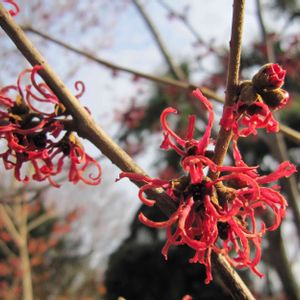 マンサク: ルビーグロウ マンサクとシナマンサクとの交配種 濃い赤色 しわしわのよじれた花弁