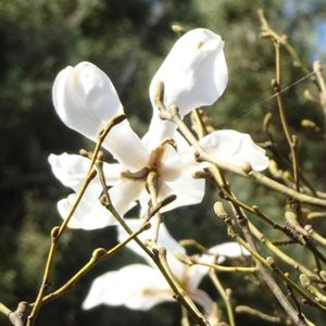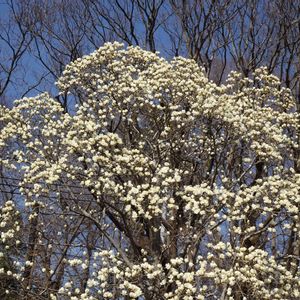 タムシバ コブシが花の下に一枚の葉をつけるのに対し タムシバの花の下に葉がない 花芽はモフモフ葉芽はつるっと丸い