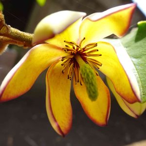 カラタネオガタマ (唐種招霊 含笑花) バナナのようの香りがして 咲いていることが遠くからでも わかりました モクレン科オガタマノキ属 中国原産 江戸時代に渡来 花期 5~6月 花弁はクリーム色で縁が淡紫を帯びる 雄しべ群と雌しべ群の間に軸が有るのが オガタマノキ属の特徴