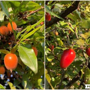 左 シセントキワガキ(四川常磐柿)常緑 実が柄にぶら下がる つくばねのようなへた 右 ロウヤガキ(老爺柿)