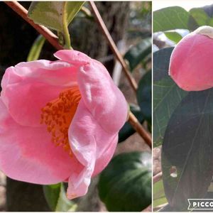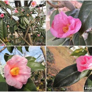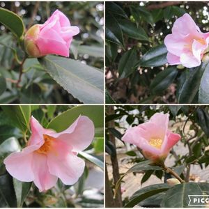 これも名札がないのですが 侘助椿:数寄屋 ではないでしょうか 白侘助の並びにありました 濃い緑の先の尖った葉の間に 小輪の淡い桃色の花が覗いていました