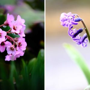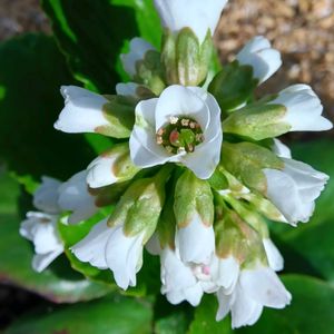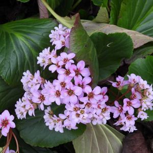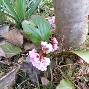 ヒマラヤ雪ノ下(ヒマラヤユキノシタ) ユキノシタ科ベルゲニア属の多年草。東アジア〜中央アジア原産。明治時代初期に鑑賞用として渡来し、庭や花壇、鉢植えなどで栽培される園芸植物。高山植物なので乾燥や寒さに強いが、暑さや多湿に弱い。丈夫で育てやすいので、株分けにされてあちこちで見られる。草丈10〜60㎝で、地上に出る太い根茎に厚くて丸い光沢のあるうちわのような大きな常緑の葉をつける。葉は寒さにあうと紫紅色を帯びる。冬の紅葉した草姿も美しく、切り葉としても利用される。花期は2~5月。日だまりでは2月頃から花が咲く。高さ20〜30㎝の花茎に淡紅色あるいは白色の花が多数集まってつく。別種どうしの交雑種も多く作られているが、どれも区別せずヒマラヤユキノシタの名で流通している。 出典『都会の草花図鑑』『色と形で見わけ散歩を楽しむ花図鑑』『花の事典 970種』