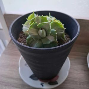 おはようございます☀ きのうの園芸屋さんのイベントで手に入れました ✨アガペ 王妃雷神斑入り✨ 小さな子なのに 子供をふたつも抱えています 怖いので しばらくはこのままにしてしてみようと思っています。 冬が来ますが 綺麗な形に育って欲しいなぁ💦