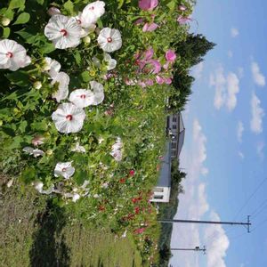 今日も猛暑日予想… すでに31℃になりました 日射しが強すぎて、花色の濃い赤系は焼けてしまいます(^_^;) 来年は遮光ネット張るかな… 🏷️フヨウ畑