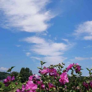今の気温は2℃(^_^;)💦 予想は36℃の猛暑日 ムクゲも咲きはじめました 🏷️雲仲間、いい感じです