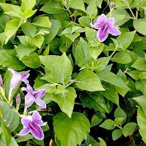【アシスタシア】《キツネノマゴ科》 「アシスタシア・インツルサ」 花言葉 「女性美の極致」 別名 タイノオモイデ コロマンソウ 熱帯の花 高さ60~100cmほどになる常緑多年草または亜低木。 茎の基部は木質化します。 葉は対生する単葉で、長さ6~8cmの卵形となり、葉の縁は全縁です。 茎先に総状花序を出します。 花は径2~3cmほどの漏斗状で、先が5裂します。 花色は赤紫色で花弁の縁に白い縁取りがあります。 苞は小さく、めだちません。