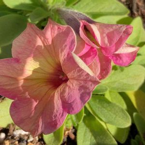 零れ種サフィニア連投失礼します(´・ω・`;) 2つ目が咲きました✨ 最初の花よりいい感じ🌸 ショッキングピンクとイエローのグラデ 花の中心は紫…花のサイズ的にもやっぱり親は江戸絞り? しばらく観察してみます( ^ω^ )♪