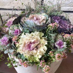葉牡丹の寄せ植え♡ 年末、お値下げされていた葉牡丹✨ 本日やっと寄せ植えにしました🤗🪴 追記 大きな葉牡丹は420円→110円✨ 小さいのも4本入りで値下げで110円✨ やっぱり言いたくて〜😆👍 余ってポット苗のままだったカルーナとアリッサムを一緒に寄せてスッキリしました😏♪