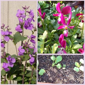昨日までとは打って変わって良いお天気☀です。 左 ムラサキハナナが満開に❣️ 右上 種からのウサギビオラ 強い風にも負けなかった強い子💕 右下 葉大根 この雨で、ネギ、ニラ、ニンニク、ミツバなど野菜がぐんと成長しました。 フェリシアとロベリアの他色も蕾が開きかけています(*^^*)