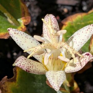 【杜鵑草】《ユリ科》 花言葉 「永遠にあなたのもの」「秘めた意志」 「秘めた恋」「秘めた思い」 「恥ずかしがりや」「永遠の若さ」 別名 油点草(ユテンソウ) 和名の「杜鵑草(ホトトギス)」は、花に入った紫の斑点が鳥のホトトギスの胸の模様に似ていることに由来します。 英語では「Toad lily(ヒキガエルのようなユリ)」と呼ばれます。 花の地色は白色で花のすべてに紫の斑点が入ります。花は上を向いて咲きます。