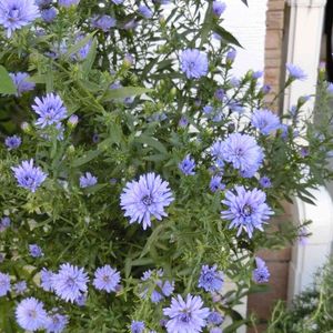 八重咲きのクジャクアスターです。 クジャクアスターは元々白い花のみでしたが、ユウゼンギク(友禅菊)との交配で花色が多様化しピンク・紫・青・藤色などが生まれています。 1つひとつは2cm程の小さな花ですが 株いっぱいに花が付きボリューム感もあり華やかです。 北アメリカ原産。 キク科キク属の多年草。