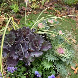 昨日植え込んだ、葉牡丹寄せ植え 赤紫のチューリップ🌷仕込んであります ビオラがもりもりなってくれるよう、週末に切り戻すつもりです。そして、挿し枝に挑戦してみます💪 カレックスは、地植えで増えて増えて、60センチ位のカレックス山が6山はある中からむしり取って植え込みました😆