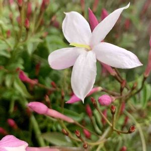 今日の花 ハゴロモジャスミン(モクセイ科・ソケイ属) 白色の花びらの外側がピンク色で ピンクの羽衣をまとっているように見えます 金木犀のようないい香りがします 花言葉*あなたは私のもの あなたは もはや わたしの全部 あなたが消えたら わたしも消える わたし決めた あなたを誰にも 渡さないって(﹡ˆ﹀ˆ﹡)♡