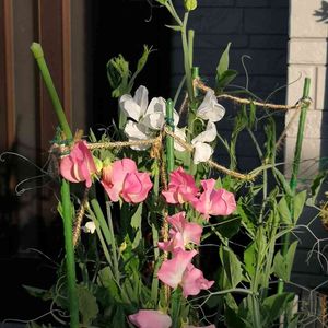 DAISOにて2袋100円(税抜き)で購入したスイトピーの種子が芽吹いて早3ヵ月半🌿 やっとスイトピーらしくてなってきました✌️ ツルが這えるように支柱を2本立てて麻縄で編んだヒモを渡しそこから何本か三つ編みにしたヒモを垂らしてみました😁 何色の花が咲いてくれるかな✨😉✨