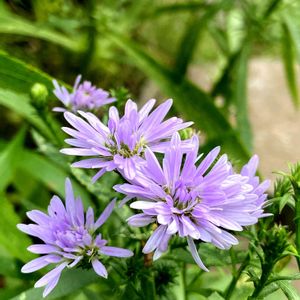 宿根アスターのお花が綺麗に咲いてました。🌸 はな阿蘇美にて 調べました。 宿根アスターは、キク科シオン属の多年草です。 宿根アスターが属するシオン属の植物は、アジア、ヨーロッパ、北アメリカに約152種が分布していますが、観賞用として栽培される品種を総じて「宿根アスター」と呼んでいます。 明確な定義があるわけではありませんが、日本では、シオンやノコンギクなどが宿根アスターの仲間に入ります。 宿根アスターの花期は品種によって異なりますが、6月~10月。 花期になると、伸びた茎の上部を多数分枝させ、頂部に花径1~3㎝程度の頭花を咲かせます。 頭花は中心部分の筒状花と、周囲で花弁のように見える舌状花から形成されている集合花です。 八重咲き品種では中心にある筒状花が舌状花に変化しています。 栽培環境 日当たりの良い場所が適しています。 半日蔭程度でも育ちますが、徒長して花付きが悪くなり、本来の美しさは楽しめません。 年間を通してよく日の当たる場所で育てて下さい。 冬越し 寒冷地の場合は、凍結対策が必要です。 秋の花後に葉が枯れて来たら、地上部を刈り取ります。 庭植えの場合は、株元に土を寄せたり腐葉土や藁で覆い、凍結対策をして下さい。 鉢植えの場合は、凍らない場所に移動して下さい。 摘芯 摘芯を行うことで、枝数が増えたくさんの花を咲かせます。 春に芽が伸びてきて本葉が5~6枚なったら、芽の先を摘んで下さい。 脇芽が出て葉が5~6枚になったら、再び摘芯の作業を行います。 2~3回程度繰り返すことで、株一杯の花を咲かせてくれるようになります。 切り戻し 秋に咲く高性種の場合は、草丈を抑えるために切り戻しを行います。 6月~7月頃に草丈の1/3~1/2の位置でバッサリと切り戻して下さい。 放っておくと草丈が伸びすぎて倒れやすくなります。 秋の花が終わって葉が枯れ始めたら株元から5㎝程度の高さでバッサリと切り戻して下さい。 増やし方(株分け、挿し木) 株分けと挿し木で増やすことが出来ます。 株分け 適期は2月~3月です。 一株に3~5芽が付くようにハサミなどで切り分けて植え付けます。 あまり小さく分けるとその後の生育が遅れるので注意して下さい。 挿し木 適期は5月~6月です。 茎を先端から8㎝程度に切り取って挿し穂にします。 下部の葉を取り除いて水揚げをしたら、挿し木用土に挿して下さい。 水を切らさないように明るい日陰で管理したら、1ヵ月ほどで発根します。 一つ一つの花は小さく派手さはありませんが、野菊のようにどこか素朴で可憐な雰囲気を持つ植物です。 花色は白、紫、ピンク、赤、青。 花付きが非常に良く、一重咲きの他、八重咲き品種もよく流通しています。