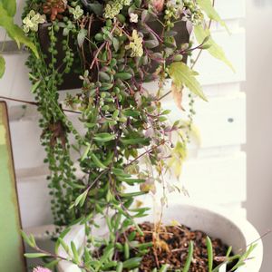 暴れ多肉さんから垂れたグリネが、下にあるクレマチス マリアコーネリアの鉢に着陸し、根付いています💦 チョッキンして寄せ植えに使っちゃおうかな~😁