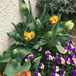 やっと寄せ植えが出来ました😅 タイガー柄のビオラが2色、ダーク色の方の花がちゃんと咲いていませんが、これからいっぱい咲くといいな😊 鉢が小さすぎたかな?💦 家にある鉢を利用しようとすると難しい〜😵