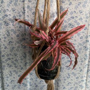 クリプタンサス 100円ショップレモンで2020年9月に買って最初に植え替えた小さなプラポットを瓶に入れた状態のまま特に問題なく育っています。最近セリアのハンギングロープで吊り鉢にしました。 品種ははっきりしません。