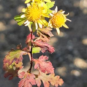 シマカンギク (島寒菊) キク科 キク属 多年草 花期:10~12月 ⑤:葉は紅葉、緑色共に左は表側、右は裏側 2025/12/10 撮影
