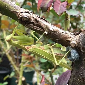 カマキリが産卵中❣️ 茶色く乾いた卵はよく見ますが、産みたてホヤホヤはこんな緑色なんですね😲