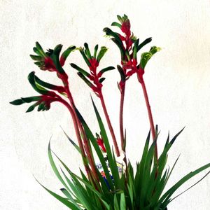 🌿カンガルーポー🌿 今まで買った事ない花🌸 カンガルーの前足のような形のユニークな花を茎とともに細かい毛が密生し細長い筒状で先端が6つにさけています。花は、穂のように何輪も横向きに片寄ったような剣状です。あやめのような葉っぱです。