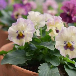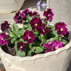 こんにちは 今まで遠巻きに見ていた ふりふりビオラ 今年は選んでみました😊 艶やかなフリル咲きビオラ アデール という種類です 素焼き鉢にしてみたら なかなか良い感じです~♪