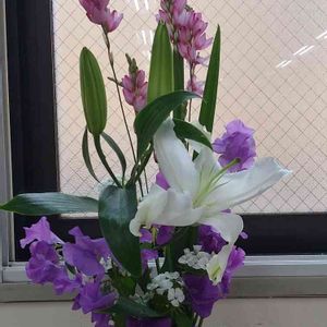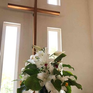 教会の庭で育てたカサブランカ 途中花芽が虫さんにかじられダメかと思ったのですが 無事開花🤍🤍🤍 本日 礼拝の最中に上の花が一輪開きました〜