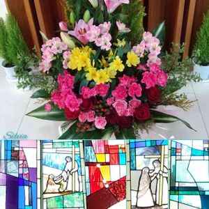 1/28 (金) ☆。.:*・゜✨ 教会の花❤️💚💗💛💚とステンドグラス💙❤️💜 1/27付📱📸💕