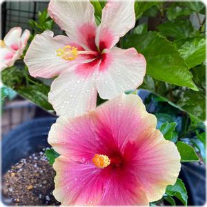 今日は☔️が降ったり、止んだり…☀️ 久しぶりの🌺クリスタルピンク❣️ 3輪咲き✨💕 まだ小さな苗🌺ミセスユミさんは、5番花💖
