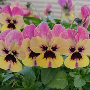 今日もビオラ 『こうめももか』2株 たくさん咲くのを待っていたら左上のストックは花が終わり、葉牡丹はとうが立ってきました😅