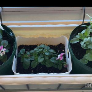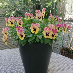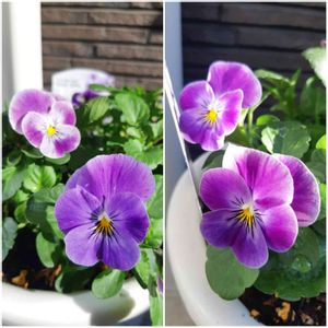 お一人様ゆったり植えにしたビオラ。 真ん中は園芸ブログで知ったキヨミさんの真似をしてダイソーのプラ小物入れに穴を開けて植え込み💕このほかに5個くらい作りました😆