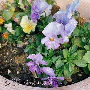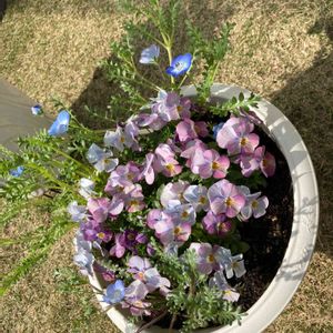 ビオラ ももかぴーちと種から育てたネモフィラ 深めで縁が垂直な鉢から、浅めで縁が広がってる鉢に植えたら、 株元の手入れが楽になり、ネモフィラがにょきっと伸びました。
