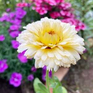 おはようございます☁️ キンセンカ スノープリンセス 春に種まきをした金盞花 虫に好かれて葉っぱは😱 咲き始めは黄色味がかかり 先進むとクリームからレモンホワイトになるユニークカラーを楽しめる。 とタネ袋に書いてある〜💛 これから色の変化が楽しみです 今日はお天気回復です。 元気にお過ごしくださいね