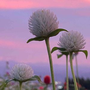 おはようございます☀ センニチコウ 今年はタネから4色の千日紅を 畑で育ててます。 白、ピンク、濃いピンク、赤色 昨日、久しぶりの雨☔️ マクロレンズでこの花を覗くと👀✨ キラキラの雨粒が🤩 ピンクの方が綺麗に見えますが 今年は白花です 今日も元気にお過ごしくださいね