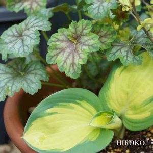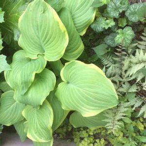 シェードガーデンの ヒューケラ キャラメル ホスタ ハルシオン ホスタ フランシー リシマキア オーレア このエリアは今が一番葉の色が鮮やかでみずみずしいんです😊 今日は午前中☔️ですが植物達には恵の雨。四月に植えたての株もこれでまたグンと成長するはず。