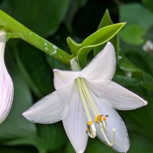 葉っぱは普通のホスタ 原種?だけど花の立ち上がりがお見事👍 5つぐらい植えたから、花がたくさん高く連なって上がってホント素敵💕 そして雨が似合うのよー♪