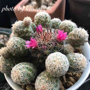 おはようございます~🍄 よいお天気ですね☀️ マミラリア 銀手毬🌵🌵 お花咲いてる🌸🌸🌸
