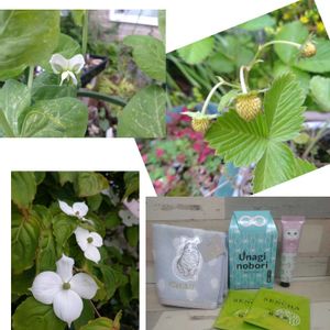 うめこさんからの素敵便💕 猫のタオルハンカチ うなぎのぼり(くるみの焼菓子) お茶🍵 ハンドクリームも、ニャンコが付いてた😁⤴️⤴️ うめこさん、素敵な物を有難うございました🙇 庭に咲いてる白い花達 ↖キヌサヤ ↙ヤマボウシ ↗ワイルドストロベリー 実が白いのですよ。