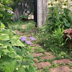 レンガの道に、青色フジバカマが咲きました♡ 庭仕事をサボってるので雑草だらけ(˚ ˃̣̣̥ω˂̣̣̥ ) 猫じゃらしがイキイキしてます(๑•́ ₃ •̀๑)