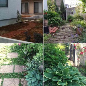左上の写真。入居して間もない頃。一番最初にした庭作業はレンガの道作り☆本当に何もない庭でした。門周りと白い壁は業者さんにお願いして、あとは全て1人で‼︎植物選び、レイアウト、植え付け…。コニファーとか樹木の植え付けは本当に大変でしたー(˚ ˃̣̣̥ω˂̣̣̥ )植え続けて5年、ようやく庭らしく緑豊かになりました♪