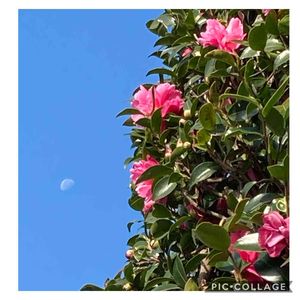 朝は曇ってましたが☁️今は気持ちのいい青空です🌤 月🌙がよく見えたのでサザンカと一緒に🤳写真だと月はよく見えないんですね〜🤔残念😅💞💞💞