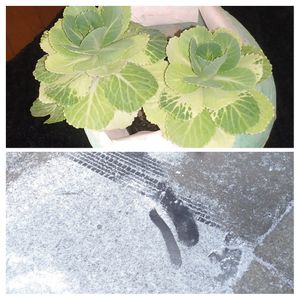 かろうじて💚 生きてます ハボタン❗(もちろん室内) かろうじて 転倒まぬがれた足跡‼️左足がすべつた 可燃ごみを出す日 しっかり見ても すべる💦 うっすらと降った雪が 極上の滑りの氷を隠す もう😱 きれいなんだけどね 🐯ケガスル