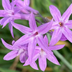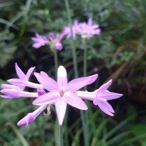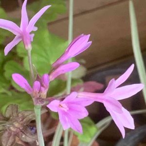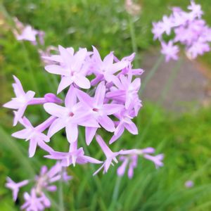 🪴草花たち その65 ツルバキア・ビオラセア アガパンサスに似た草姿 可愛いらしい星形のお花に出会いました ( ´ ▽ ` )💜 🔹ツルバキア でアナグラムに挑戦〜🎉 🏡私の庭に「ツバキアル(椿ある)」 …( ̄∇ ̄)ちょっとキビシイかな💦 🔖おきょうさん主催 🏷GSアナグラム 🔖mako(#^.^#)さん主催 🏷星屑ファンタジー 🔖 🏷美しく青きドヨウ に参加します♡ ☀️ *・゜゚・*:.。..。.:*・'🍃✨・*:.。. .。.:*・゜゚・* ⌘ メモ ⌘ 🔸科名・属名 ヒガンバナ科 ツルバキア属 注)分類によりユリ科・ネギ科 🔸学名 Tulbaghia violacea 🔸英名 Society garlic Pink agapanthus 🔸別名 ⑴ソサエティ・ガーリック ⑵スイートガーリック ⑶ピンクアガパンサス ⑷ツルバギア(学名の正確な読み) ⑸ルリフタモジ(瑠璃二文字:和名) ⑹ オキナワハナニラ (沖縄花韮) 🔸由来 ⑴ソサエティ・ガーリック ニンニク臭を放つものの、食べてもニンニク 臭くはならない(と思われていた)ことから ⑵ピンク・アガパンサス アガパンサス(ムラサキクンシラン)と似た 姿をしていて、ピンク色の花をつけることに よる(アガパンサスとは別種) ⑷ツルバキア 18世紀オランダの喜望峰総督ツルバグの 名前に因む。 ⑸ルリフタモジ 瑠璃は花色の薄紫色、二文字はニラを指す。 🔸原産地 南アフリカ 🔸花期 6月~9月 🔸花色 紫 ピンク 白 🔸特徴 球根植物。半常緑性多年草。宿根草と球根の中間 で、両方の性質を併せ持つ。 一般にヒガンバナ科の植物は毒性がある。 アガパンサスを小型にしたような草姿で、すらり とした立ち姿が美しく、シンプルでスッキリした 印象。 沖縄で帰化が報告されている帰化植物。 太めの花茎を30~40cmほど伸ばし、茎頂に円周 状に花が数個つく(散形花序)。 花は漏斗状で6裂して星形、開いた花弁の基部には スイセンにみられる小さな副花冠があるのも特徴。 葉は幅が細く30cmほどで枝垂れる。 葉や茎には、ニラなどネギ類に特有の臭いがある。 暑さや乾燥に強く、長雨にも耐え、育てやすさが 魅力。ナチュラルガーデンやコンテナの寄せ植え など、アガパンサスと同様に利用する事ができる。 🔸品種 南アフリカに24種が自生し、主に栽培されるのは、 次の2種。 ⑴フラグランス(Tulbaghia simmleri) 甘い芳香があり切り花としても利用される。 ⑵ビオラセア(T. violacea) 四季咲き性が強く春から秋遅くまで咲き続ける。