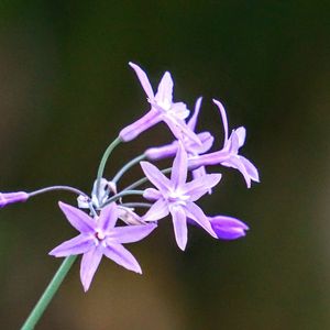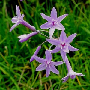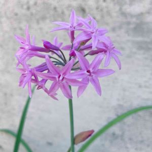 ルリフタモジ 別名のこの名前の方がいい感じ💕 南アフリカ、ジンバブエ原産で、キジカクシ科ツルバギア属の多年草です。線形の根生葉の間から出た花茎先端から伸びた散形花序に、漏斗形で先端が6深裂した紫色の小花を10輪ほど咲かせます。茎や葉を折るとニンニク(大蒜)の匂いがします。