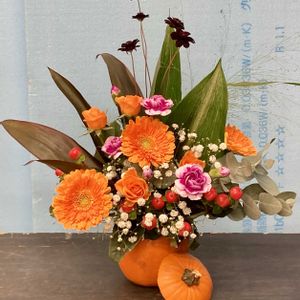 皆さま、おはようございます。☀️ 先程、かぼちゃ🎃を持ち込まれて、お昼に取りに来るからと、かぼちゃ🎃で アレンジフラワーを頼まれました。 固いかぼちゃ、 切るのも一苦労! でも、なんとか切って、 中をくり抜き、オアシスを入れて、アレンジフラワーを制作しました。