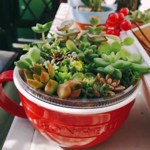 初ちま寄せしてみました!!! セリアの真っ赤なスープマグが可愛くて、活用したくて😍 でもドリルないので、セブンのシャキシャキナムル入ってたサラダパックに穴を開けて被せたらシンデレラフィットです(*´ー`*人)♥♥ 仕立て直し中の星&月の王子達のスキマにセダムをただただ詰め込んだだけで自己満足ですが楽しかったです♪