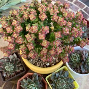 クラッスラ多肉🌱 このコ達は長く紅葉が楽しめますが、さすがにそろそろ緑になってきたかな😊 雨で皆んな軒下避難☂️ 雨が少し上がった隙に、雑草抜き抜き🍀 テレワークの暇つぶしです😆 頑張ろう!日本!