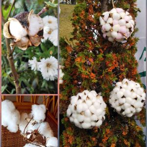 花とみどりのマルシェでは ボール⚽️の様な綿の玉が あちらコチラに、ぶら下がってました。 左下は友人の家の綿 左上はウチの庭で、そろそろ弾けそうな綿